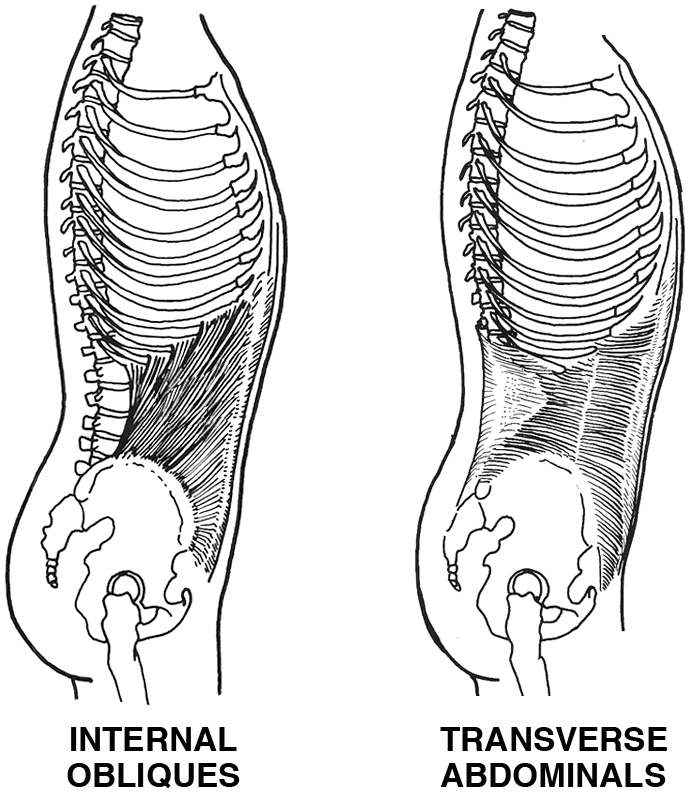 • Internal Obliques and Transverse AbdominalsThe Internal Obliques lie under the External Obliques and run from the inguinal ligament (in the area of your bikini line) to the last four ribs. Like the External Obliques, they too flex and rotate the spine.